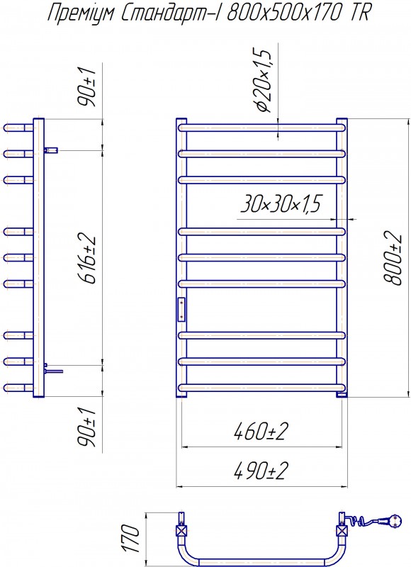 Електричний полотенцесушитель Mario Преміум Стандарт-I TR 800x500 / 170 праве підключення