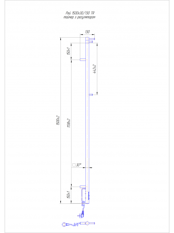 Електричний полотенцесушитель Рей Кубо-І 1500x30 / 130 TR з регулятором часу і температури нагріву. Регулювання температури в трьох режимах: 40 ° С, 45 ° С, 50 ° С. Полотенцесушитель Рей Кубо-І виробничого підприємства Маріо, висотою 1500 мм, шириною 30 мм. Номінальна потужність 50 W. Полотенцесушитель обладнаний таймером, який дозволяє встановити час нагрівання на 3 і 6 годин, або переключити режим роботи на постійний нагрів.