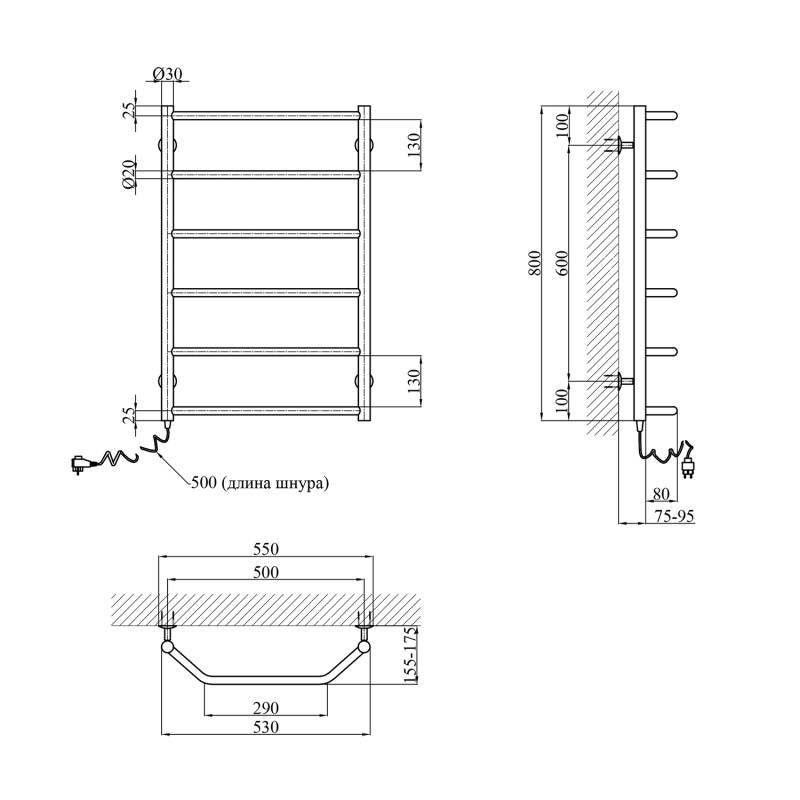 Електричний сушка для рушників Kroner Трапеція 800x500/6 ЕL ліве підключення нерж.сталь хром ДТ10ЕL