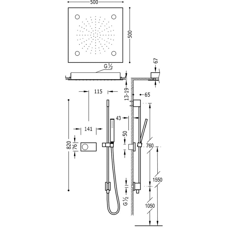 - Вбудований стельовий душ INOX 500x500 мм