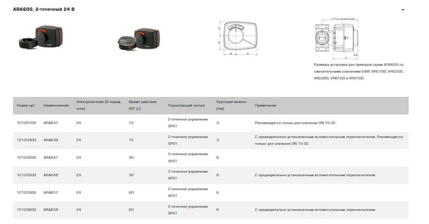 Серія ARA600 з двоточковим сигналом (увімкнути/вимкнути) підходить для операцій відведення спільно з такими клапанами, як VRG230. У цих сферах застосування використовуються лише кінцеві положення робочого діапазону приводу. Компактний привід розроблений для керування ротаційними клапанами DN 15-50 та має робочий діапазон 90°. Серія може легко керуватися вручну за допомогою ручки "натиснути і повернути" на передній частині кришки. Додатковий перемикач, доступний як встановлений або окремим набором, може бути легко встановлений у будь-яку необхідну позицію за допомогою оригінального рішення.