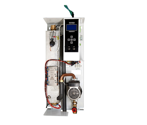 Електричні котли серії «Преміум» ТМ Tenko надають широкі можливості для управління роботою пристрою і забезпечують максимальний комфорт і автономність експлуатації при опаленні різних приміщень з максимальною площею 150 кв.м. Представлена лінійка обладнання відрізняється наявністю вбудованого мікроконтролера і програмної системи управління для повного контролю працездатності котла. Модель котла «Преміум» має цифровий дисплей для настройки і відображення сервісної інформації від трьох датчиків температури: кімнатного (проводового або радіо), датчиків на прямому і зворотному трубопроводах системи опалення. мікроконтролер здійснюєуправління блоків ТЕНів і реле, а вбудований програмний лічильник електроенергії веде статистику і дозволяє оптимізувати роботу. Безшумна робота при комутації забезпечується твердотільними реле з водяним охолодженням. Всі моделі електрокотлів «Преміум» виробництва компанії Tenko укомплектовані циркуляційним насосом фірми Grundfos (Данія), датчиком тиску, автоматичним відвідників повітря, запобіжним клапаном і недельно / добовим програматором, яким можливо керувати за допомогою wi-fi модуля. Дистанційне керування котлом здійснюється через будь-який браузер або додаток на Android.