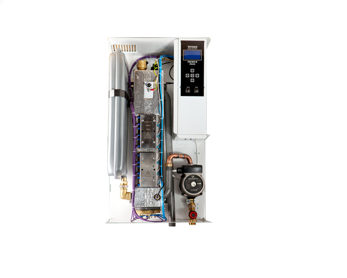 Серія електричних котлівTM Tenko "Преміум Плюс" укомплектована продуктивним трьохшвидкісним циркуляційним насосом фірми Grundfos (Данія), розширювальним баком Zilmet (Італія) об'ємом 7 літрів, запобіжним клапаном, автоматичним відводом повітря, цифровим датчиком тиску з робочим діапазоном від 0,9 до 3 бар .