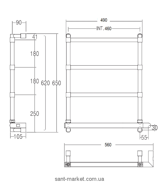 Відстань між центрами отворів кріплення до стіни - 460 мм;