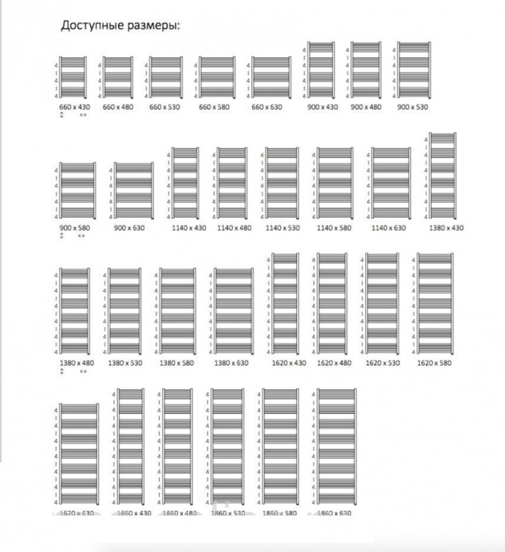 Незважаючи на велику висоту, полотенцесушитель всього 480 мм в ширину. Вузька конфігурація зручна тим, що без зусиль поміщається на невеликому вільному ділянці стіни або в ніші. При бажанні можна замовити більш габаритнийопалювальний прилад, якщо дозволяє площа.