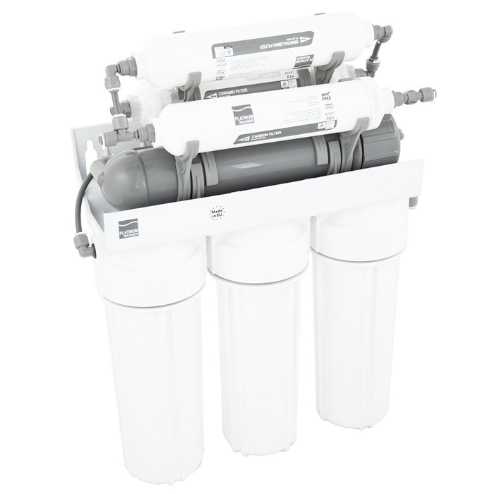 Platinum Wasser Ultra 7 - високоякісна система зворотного осмосу від німецького виробника. Система - семиступінчаста з мінералізатором і биокерамическим картриджем. Фільтр встановлюється під мийкою і виводиться на окремий невеликий подвійний кран для питної води (очищена і мінералізована).