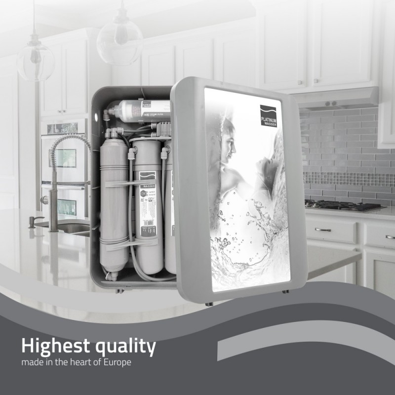Фільтр для води Platinum Wasser Neo 7 в боксі - це ефективна система фільтрації води, поміщена в елегантний і стильний корпус. Компактна і надійна система молекулярної фільтрації - це єдність унікального дизайну і ергономічного корпусу. Нова технологія дозволила з'єднати картридж і його корпус в одне ціле. Ідеально підходить для підвісної установки або вільного положення стоячи. Система молекулярної фільтрації води заснована на зворотному осмосу з 2-ступінчастою передфільтрації фільтрацією, мембраною 75 GPD і картриджами з мінералом і біокерамікою в постфільтраціі.