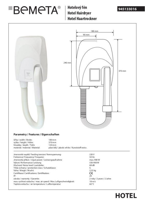 Фен для готелю Bemeta Hotel білий глянець 945133016