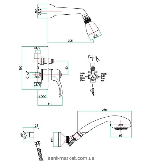 Змішувач прихованого монтажу для душу, в комплекті з антивондальним душем, ручним душем, шлангом та настінним тримачем