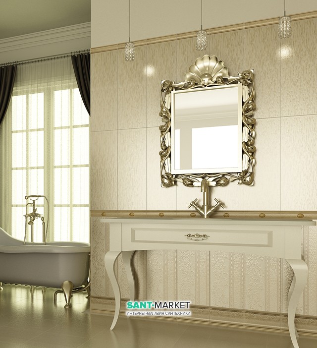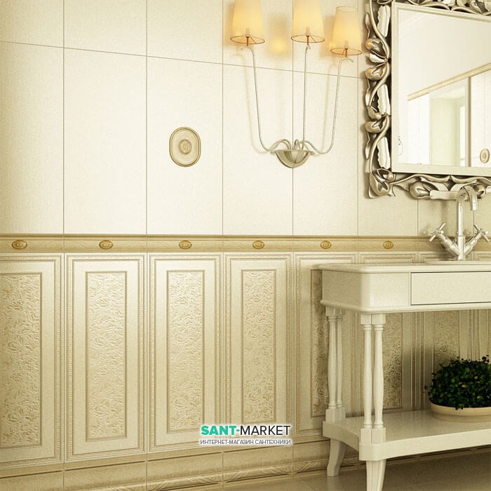 Глянцева глазур кремового відтінку в золотих вкрапленнях перламутру імітує текстуру ніжної тканини. Елегантний декор з цокольних, настінних панелей, прикрашених хитромудрими візерунками та рельєфних бордюрів з витонченими медальйонами,наповнить інтер'єр затишною та теплою, романтичною атмосферою та відчуттям спокою та блаженства.