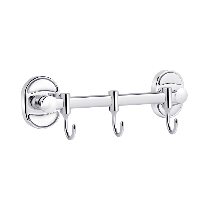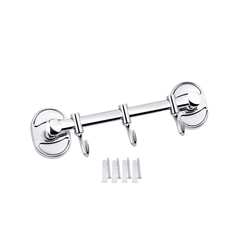 Тримач для рушників і халатів Kroner KRM Elbe - ACC2914-3 виконаний у вигляді стрижня з трьома рухомими гачками на ньому. Тримач для рушників виготовлений з міцного металу з хромованим покриттямповерхні. Прихований монтаж допомагає зберегти обробку, а хромоване покриття запобігає корозії та бруду. Тримач для рушників кріпиться на стіні на потрібній висоті.