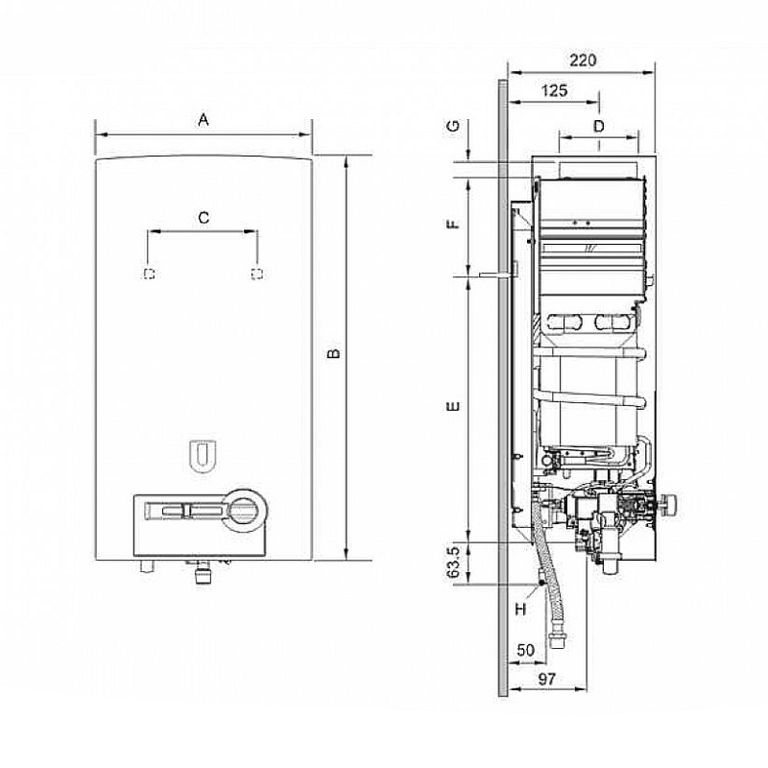 - запобіжні пристрої: іонізаційний контроль полум'я, що перешкоджає небажаному погасанням полум'я пальника, контроль тяги, що вимикає прилад при недостатньому відводі димових газів, обмежувач температури на виході гарячої води