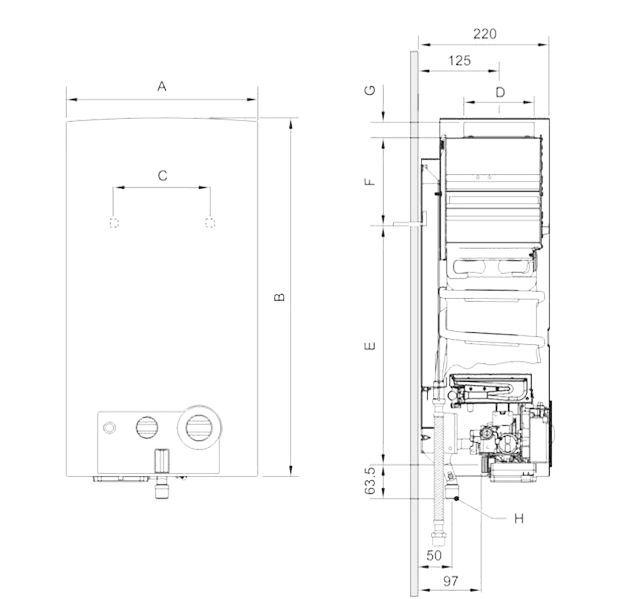- запобіжні пристрої: іонізаційний контроль полум'я, що перешкоджає небажаному погасанням полум'я пальника, контроль тяги, що вимикає прилад при недостатньому відводі димових газів, обмежувач температури на виході гарячої води