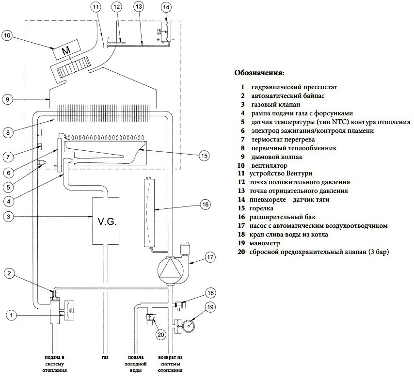 - Запобіжний клапан в контурі опалення (3 атм.);