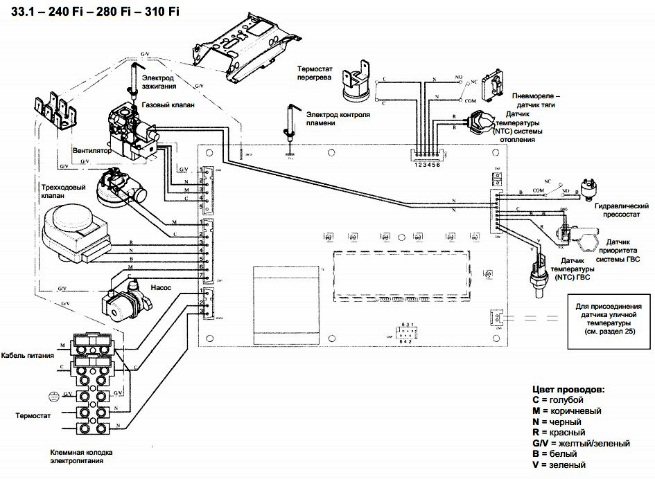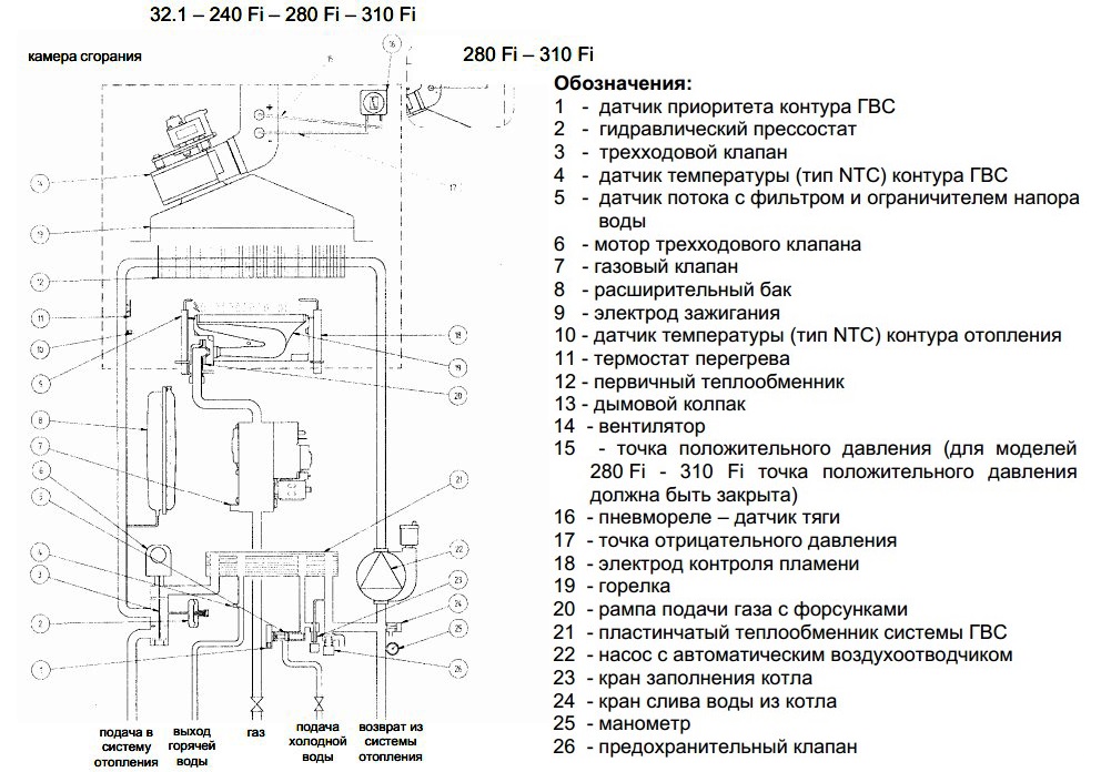 - Датчик тяги для контролю за безпечним видаленням продуктів згоряння (пневмореле - для моделей із закритою камерою згоряння, термостат - для моделей з відкритою камерою);