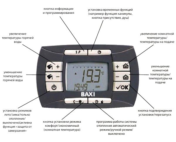 - Два діапазони регулювання температури в системі опалення: 30-85 ° С і 30-45 ° С(Режим «теплі підлоги»);