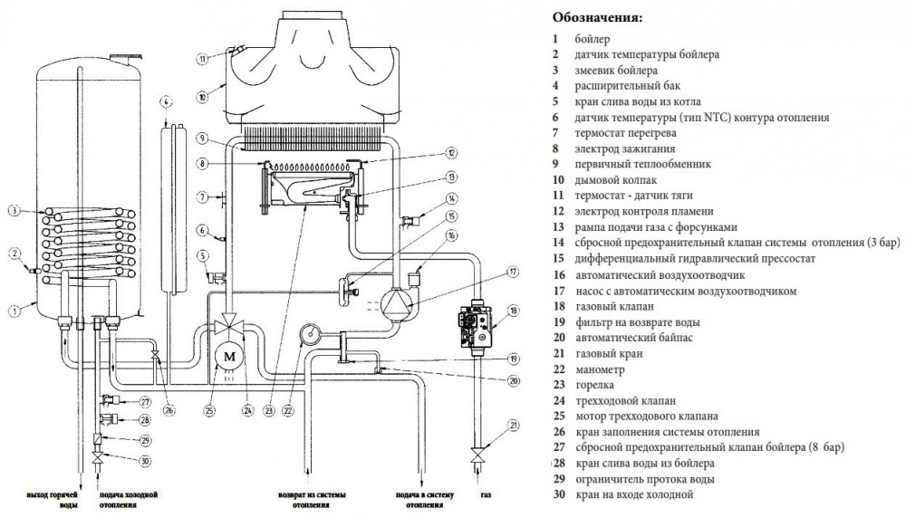 - Запобіжні клапани в контурі опалення (3 атм.) І в контурі ГВП (8 атм.);
