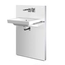 самонесуча конструкція з обшивкою зі скла з переднього боку (одношарове безосколкове скло) та обшивкою з матового алюмінію з бокових сторін, попередньо встановлені тримачі для приєднання арматури до 2-штуцерних змішувачів, вбудованих у стіну, висувний бічний ящик з механічною підтримкою
