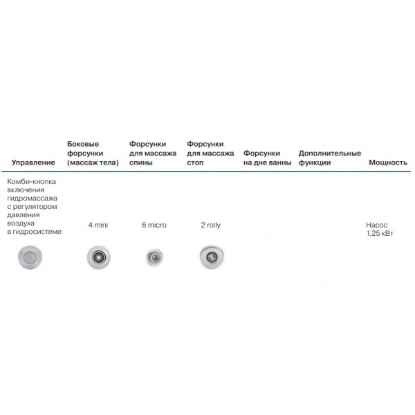 - міні-рол форсунки для масажу ступень (2 шт) або мікро форсунки для масажу ступень в разі комплектації ванни Millenium (4 шт)