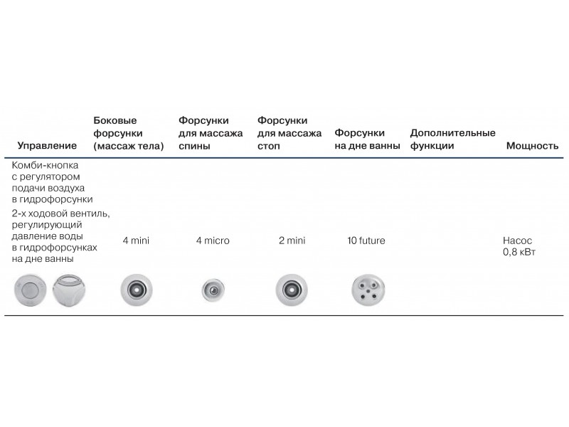 - 2 міні-рол форсунки для масажу ступень ніг (створюють завихрення води, що дозволяє масажувати велику площу тіла. Для ванни Milenium - 4 мікро форсунки для масажу ступень ніг)