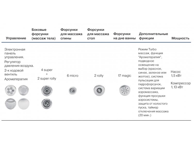 Режим Turbo масаж, функція "Ароматерапія", підводне освітлення (на вибір