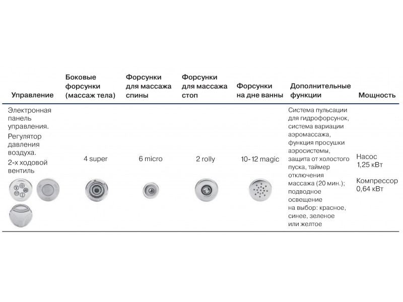 10-12 magic-форсунок на дно (в magic-форсунках струмінь повітря змішується із струменем води, що дозволяє отримати "Ефект шампанського")