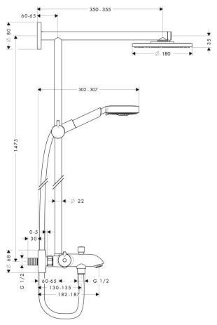 Hansgrohe Raindance Душова система EcoSmart Showerpipe 180 для ванни держатель 350 мм 27141000