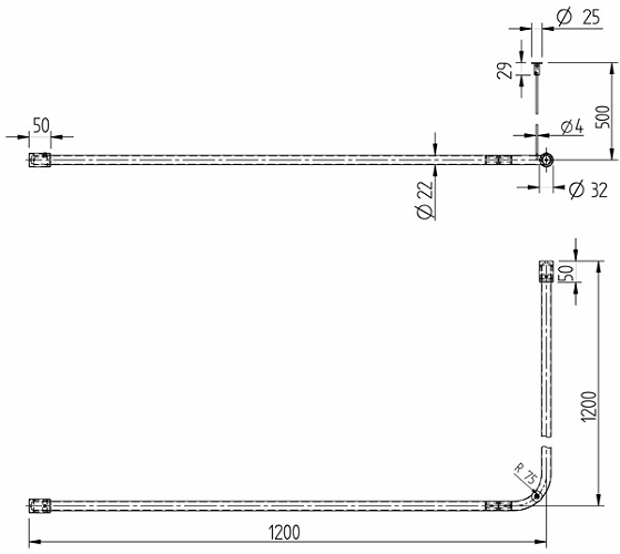- Діаметр: 22 мм, кутовий монтаж, з додатковим кріпленням до стелі 500 х 4 мм.