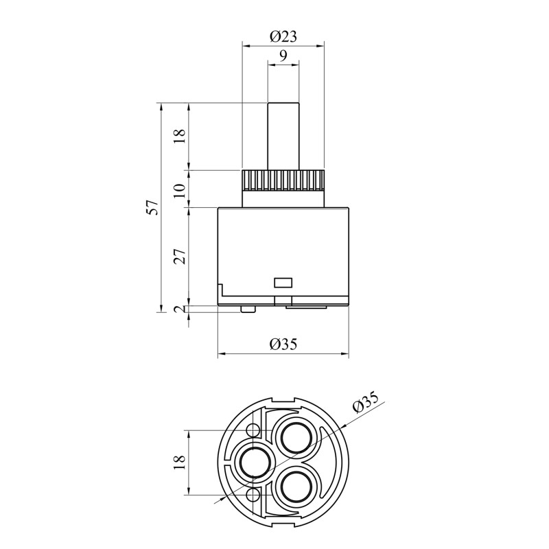Картридж для міксера Kroner KRP - PM35-1 35 мм являє собою збірний пластиковий циліндр з керамічними пластинами всередині, з трьома отворами внизу і стрижнем зверху, на який насаджується ручка.Основна функція картриджа - можливість регулювати тиск і температуру води, що подається.