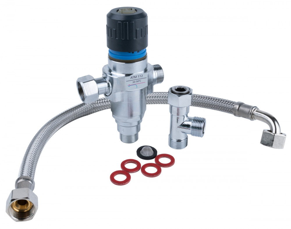 Клапан із захистом від ошпарювання Afriso ATM 112 призначений для контролю температури гарячої води. , підготовленої для водопровідних кранів. Клапан дозволяє змінювати температуру води на виході в межах 30-50°C і захищати користувачів від ошпарювання. Клапан ATM 112 призначений для установки під умивальником, для використання з традиційними кранами (гаряча і холодна вода, що подаються окремо) або одноважільний (де передбачена лише змішана вода).