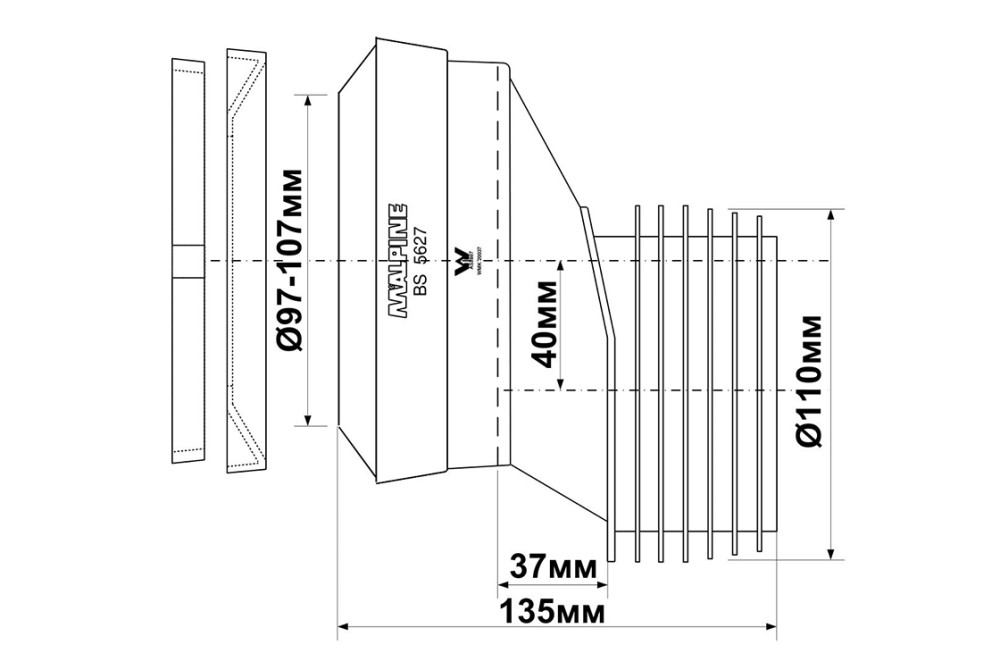 Коліно еластичне для унітазу McAlpine ексцентрик 40 мм з ущільнювачем поліпропілен білий