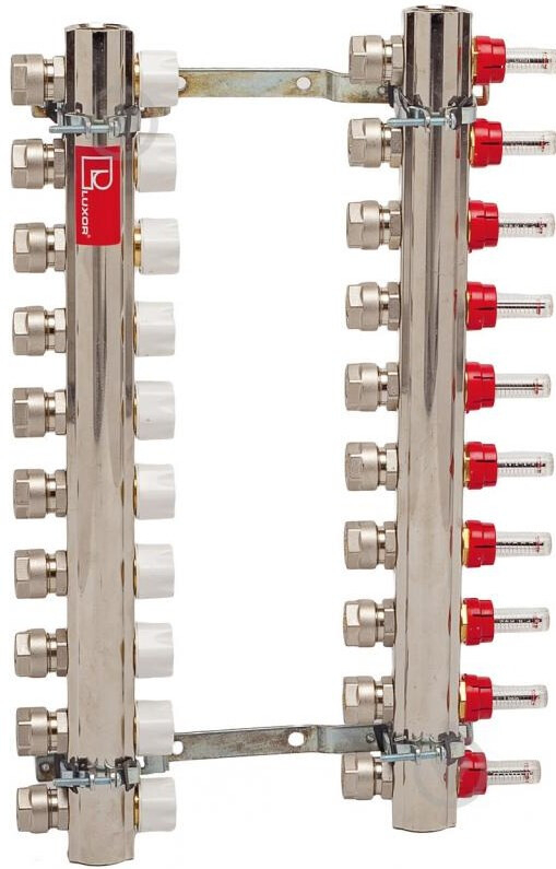 1) Колектор для систем підлогового опалення Luxor 10 контурів з відсікачем і термоклапаном