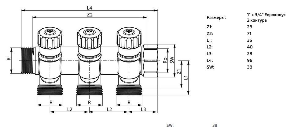 Коллектор універсальний TECE TECEflex 2 контури із запірними вентилями 1''х3/4'' Євроконус стандартна латунь