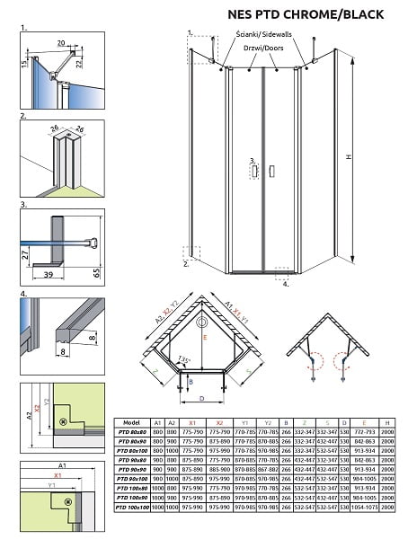 в комбінації з душовою дверима арт. 10051000-54-01 комплектується душова кабіна Nes PTD 80x80