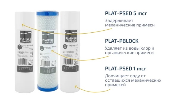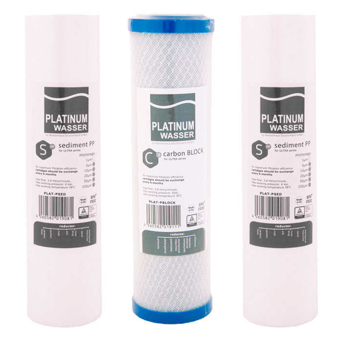 Універсальний комплект картриджів Platinum Wasser підходить для всіх систем зворотного осмосу! Набір дозволяє заощадити до 10% в порівнянні з покупкою окремо. Набір забезпечує тривалий захист від шкідливих домішок і хімііі і продовжує термін служби вашої системи очищення. Попередні картриджі мають стандартний розмір 10 дюймів і сумісні з усіма системами зворотного осмосу.
