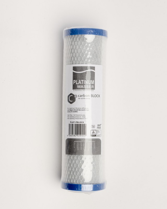 2 картридж - брикетована вугільний картридж Platinum Wasser CTO10 усуває з води хлор, неприємний смак, запах, хмарності та цвітіння води. Крім того, видаляє леткі органічні сполуки та інші загальні хімічні речовини. Картридж складаються з частинок активованого вугілля, з'єднаних в єдиному блоці з підвищеною адсорбційною здатністю і ефективністю. Карбон-блок - картридж з пресованим активованим вугіллям - призначений для очищення води від органічних розчиненихдомішок, продуктів хлорування. Видаляє запах, кольоровість, покращує смакові якості води.