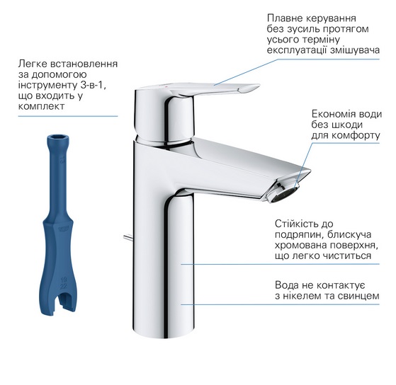 Змішувач для раковини Grohe Quickfix Start 23455002 має стильний дизайн, що підходить для всіх типів умивальників. Його установка швидка та інтуїтивно зрозуміла.
