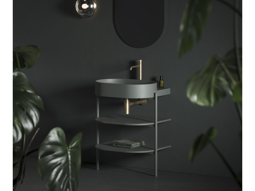 меблі з відкритим двором складається з стабільної металевої конструкції та двох полиць. Металева конструкція підлоги з поличками CS -ядра спеціально розроблена для дизайнера дворів40/60/80. Конструкція оснащена отвором для сифона та регульованими ногами. Полиці ідеально повторюють форму умивальника і забезпечують достатньо місця для зберігання. Світловий уступ верхньої частини металевих ніг служить зручним місцем для вивішення рушника.