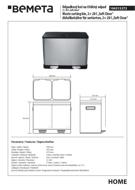 Контейнер для сортування сміття Bemeta Hotel 2×20 л матова нержавіюча сталь 104315272