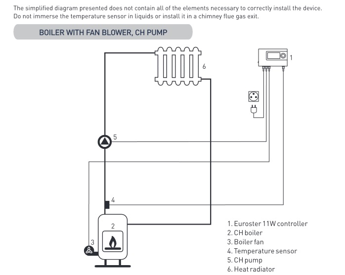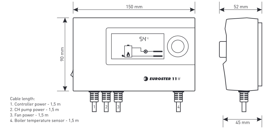 Euroster 11W - програмований контролер для співпраці з припливними котлами для дрібного вугілля та вугілля. Він плавно контролює процес згоряння, забезпечуючи оптимальну роботу - він вимірює температуру води в котлі і, залежно від цього, регулює подачу повітря в піч та керує роботою циркуляційного насоса, який Euroster 11W обладнанийсистемою антиостопного насоса, яка запобігає захопленню ротором, що не використовується. Після закінчення опалювального сезону система автоматично запускає насос кожні два тижні на 30 секунд (щоб система працювала після сезону, контролер слід залишити увімкненим).