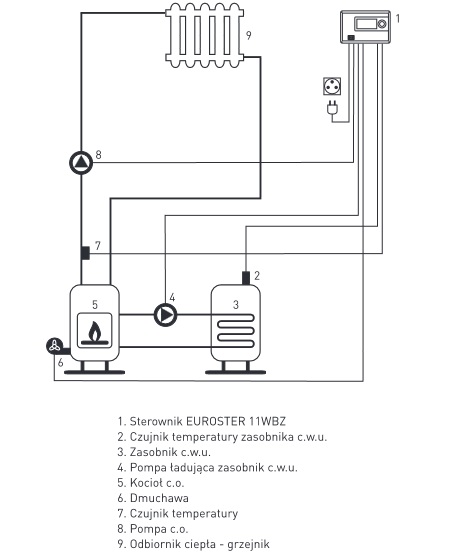- Керуючі насоси Euroster 11WBZ: циркуляція та завантаження бакагарячої води та вентилятора забезпечує оптимальну роботу котла на твердому паливі