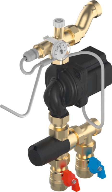 Попередньо зібрана станція керування для 3-контактного термостатичного змішувача 35-60°C зі зручними 1-6ступінчасте регулювання температури подачі системи теплої підлоги. Циркуляційний насос з електронним управлінням ES2 15-60, індекс енергоефективності (EEI) ≤0,20 з синхронним двигуном з постійними магнітами. Клас енергоефективності А (3...42 Вт). Укомплектований запобіжним термостатом (встановлений на 50 °C) для відключення циркуляційних насосів, якщо температура зворотної лінії занадто висока.