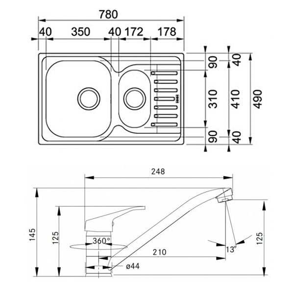 - Довжина гнучких шлангів для підведення води: 350 мм
