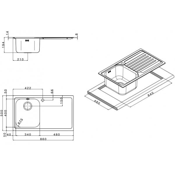 - Розміри мийки (ШхГ): 860 х 500 мм