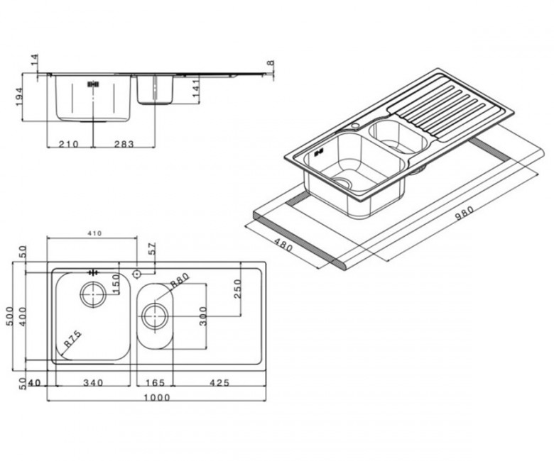 - Розміри мийки (ШхГ): 1000 х 500 мм