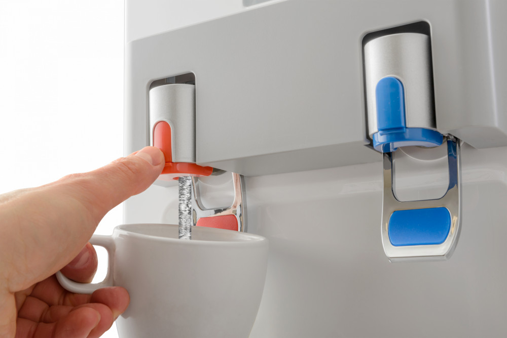 У кулері використані краніки типу "натиск кухлем" - це найбільш зручний та ергономічний варіант виконання кранів. Навіть раніше, хто не стикався з подібною технікою, буде просто іІнтуїтивно зрозуміло, як собі набрати порцію гарячої чи холодної води.