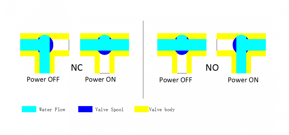 Клапан з приводом має вихідне положення "прохідний" - коли фаза (L) подається тільки на коричневий провід. При подачі напруги на чорний провід, що управляє, привід повертає шток клапана на 900 і перемикає потік рідини в іншу гілку. При знятті напруги з керуючого чорного дроту – клапан повертається у вихіднестановище. Поточне становище клапана визначається положенням ручки на приводі. Якщо ручка розташована перпендикулярно клапану – прохідний. Якщо ручка вирівняна вздовж клапана – 900. Тобто стрілка вказує який протікання зараз закрито.