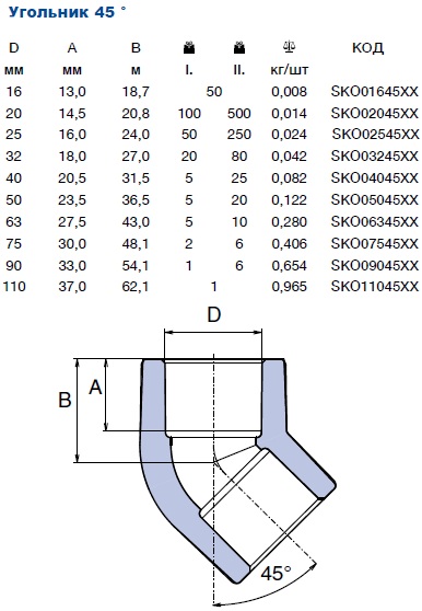 Коліно 45 ° (куточок) призначений для з'єднання трубопроводів, з одночасною зміною напрямку трубопроводу під кутом 45 градусів. Може працювати на всьому діапазоні робочих температур і тиску (в залежності від типу труби). Має компактні розміри. Ідеально підходить для важкодоступних місць. Використовується з пластиковими трубами WAVIN Ekoplastik всіх типів.