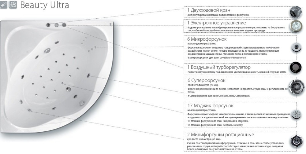 - 6 суперфорсунок середнього діаметру (73 мм). Насадки розташовані з боків. Дозволяє направляти струмінь води і регулювати її потік. 4 супер насадки для ванн Gentiana, Rosa I, Rosa II, Rosa 95, Campanula II