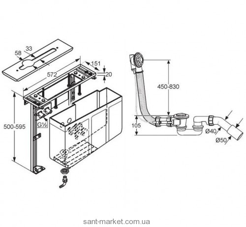 Підлягає облицюванню плиткою або спеціальною панеллю, з двома шлангами високого тиску G 1/2 x G 1/2 x 400мм, для з'єднання з кутовим вентилем, з резервуаром для збирання води при витоку, захищений від зворотного струму води, зі з'єднувальним шлангом, вкл. затискачі для шланга слив перелив G 1 1/2, з відведенням для конденсату, без набору гвинтів 76 156..-00 та зовнішньої монтажної панелі 16 021